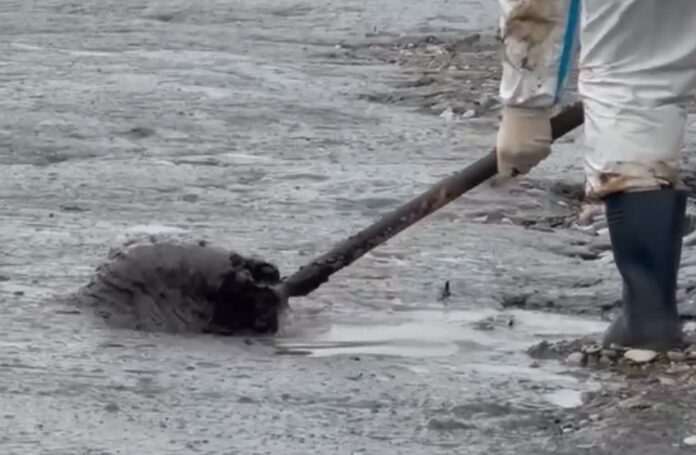 Pilsētas administrācija ir nobērusi pludmali ar svaigiem oļiem. Vides aizstāvji apgalvo, ka tas ir tikai veids, kā varas iestādes var noslēpt naftu, kas turpina noplūst ūdenī.